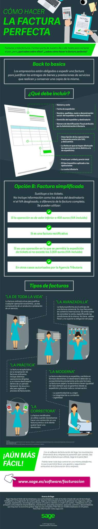 La factura es el documento mercantil acreditativo de que se ha producido una operación por un empresario o profesional. Pero, ¿Qué dice el reglamento que debe contener este documento para ser correcto? ¿Cuándo debe expedirse? ¿Sirve cualquier formato? ¿Qué modalidades de factura existen? Sage facilita a siguiente infografía que es importante revisar si estamos en el nuevo sistema SII, ya que de no surgirlo podemos encontrarnos con incidencias.